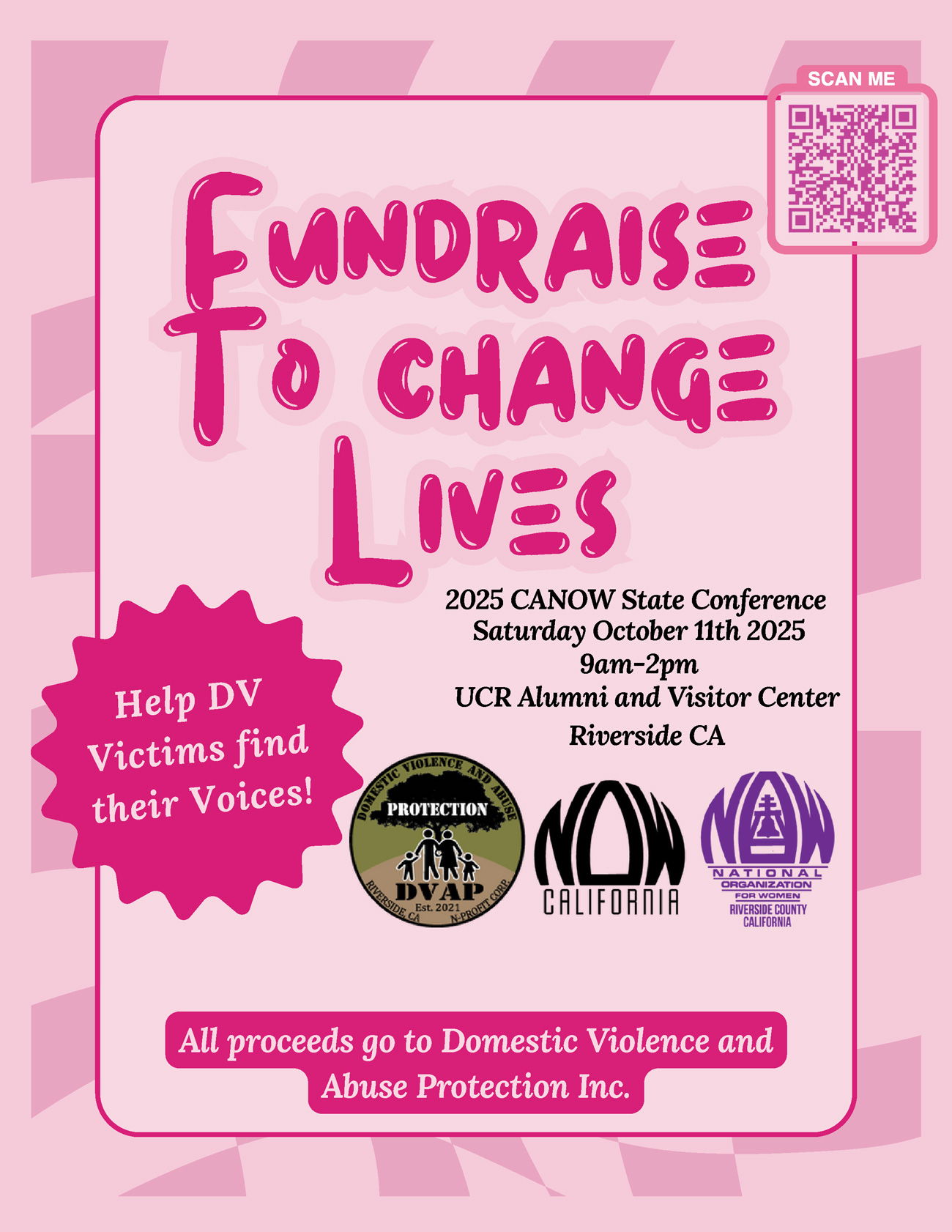 Please help us raise critical funds for Domestic Violence and Abuse Protection (DVAP) as part of our Domestic Violence Awareness Month campaign at our 2025 CA NOW conference. All funds collected will be donated to DVAP, a 501(c)(3) nonprofit based in Riverside, CA.